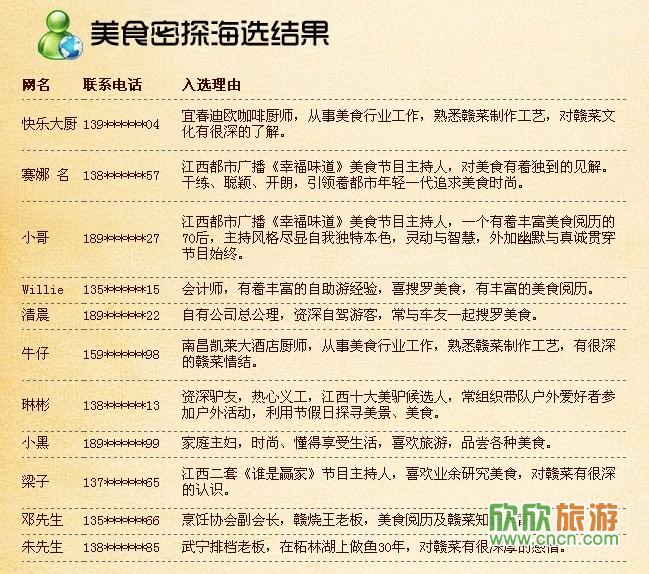 美食“密探”海选活动自启动以来,受到游客的火热追捧,报名“密探”逾万人,一时间成为热点话题。经过紧密锣鼓地审查各个参赛选手的资料,最终确定来自社会各界的11个“密探”,有厨师、会计师、资深驴友、家庭主妇、节目主持人等。