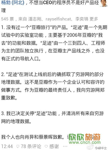 “足迹”在测试上线前后的确抓取了穷游网的部分数据,作为豆瓣的最终负责人,阿北向穷游网道歉,并决定关停“足迹”功能,清除所有来自穷游网的地理数据,他个人也向肖异和蔡景晖致歉。