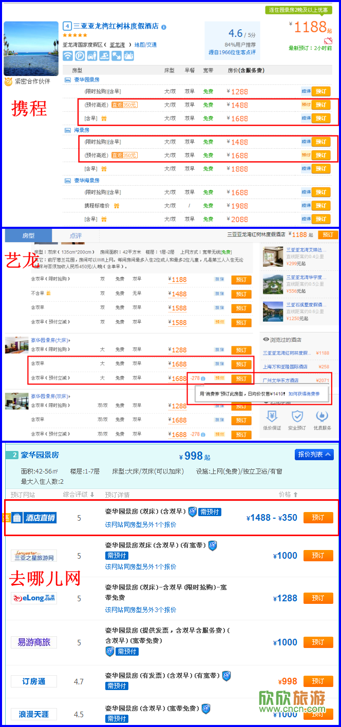 图一:携程、艺龙及去哪儿上“三亚亚龙湾红树林度假酒店”的预付产品价格