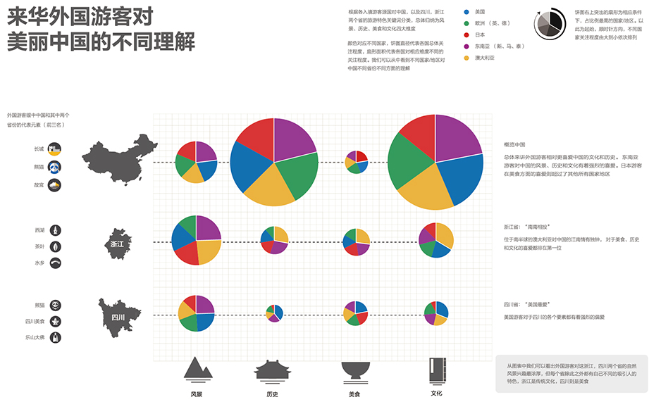 外国游客对浙江、四川两个省的自然风景兴趣最浓厚,但是每个省都有不同的特色。浙江的的传统文化最吸引外国游客。其中,澳大利亚游客对杭州最感兴趣的不是西湖,而是丝绸。在四川,最受外国游客欢迎的则是当地美食。不过美国人相比较其他国家更喜欢成都的名胜古迹,比如都江堰。