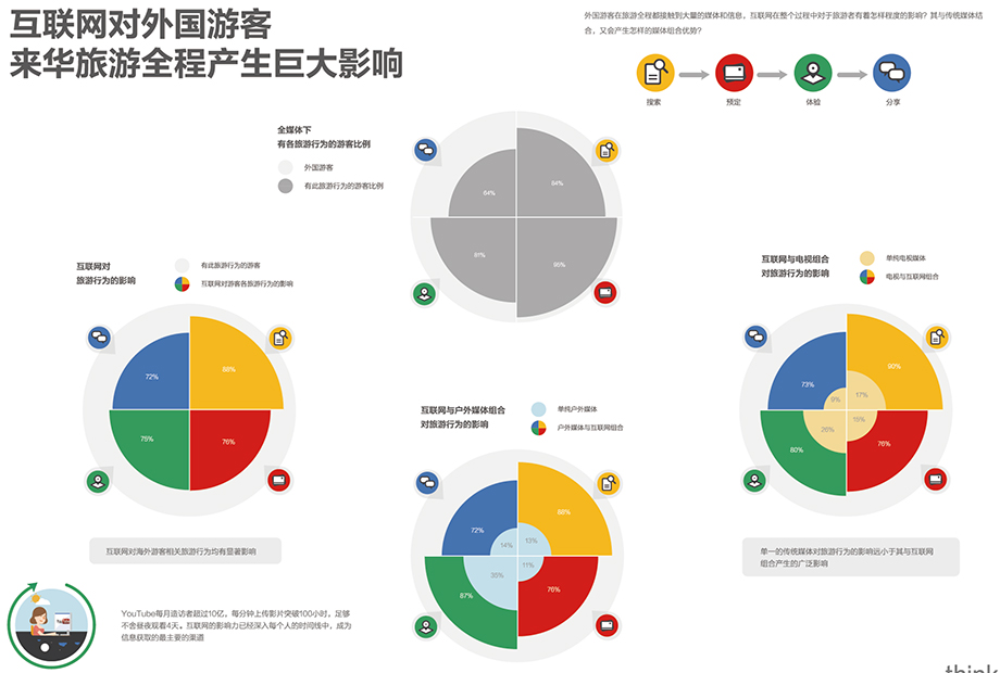 调查显示,互联网在外国游客的旅行中发挥了重要的作用。在旅游的信息搜索、预订、体验和分享等环节中,互联网拥有超过70%的影响力。网络媒体渠道成为被访者最主要的信息收集来源,超过其他媒体。88%的游客会通过互联网获取旅游信息;其中使用搜索引擎进行信息收集的被访者比例最高,达到49%。数据显示,通过搜索引擎进行信息收集的被访者中,92%使用Google。