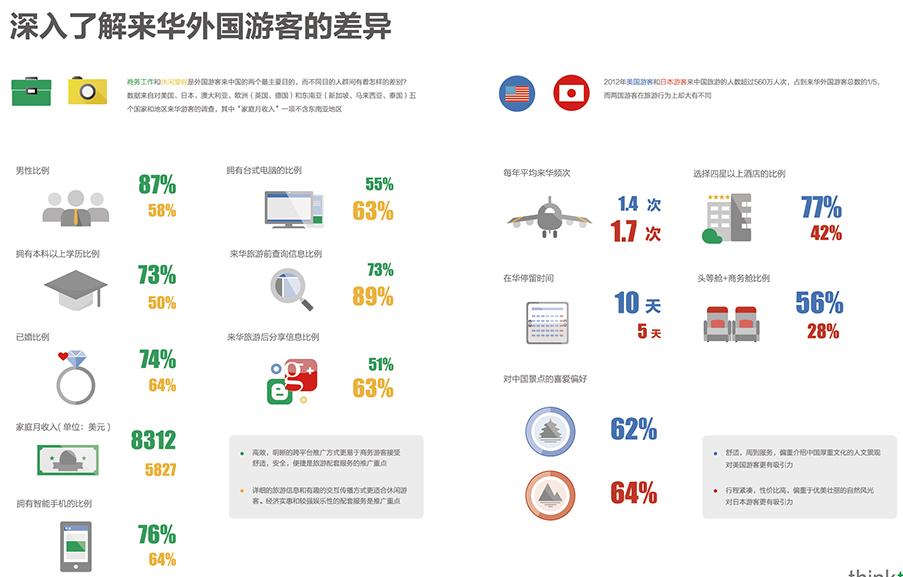 因此Google建议,中国旅游目的地需要更多的触发外国游客的文化探寻需求;并在宣传过程中,适当弱化省份概念,以有中国特色的传统文化(如传统建筑)、历史和风景等作为创意主流;再将各国旅客感兴趣的中国元素融入宣传中,从而塑造区别于亚洲其他国家、独一无二的美丽之处,创造中国旅游新形象。