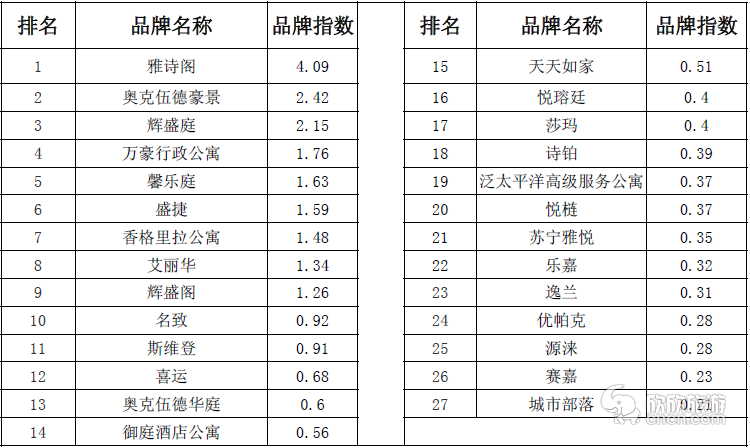 2015年7月,根据迈点旅游研究院(MTA)对服务式公寓品牌品牌指数的不完全统计,本月服务式公寓品牌风云榜TOP10依次是雅诗阁、奥克伍德豪景、辉盛庭、万豪行政公寓、馨乐庭、盛捷、香格里拉公寓、艾丽华、辉盛阁以及名致。