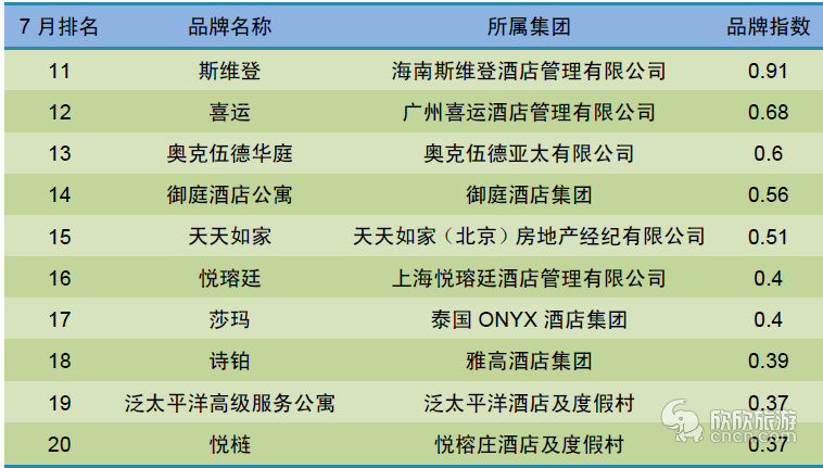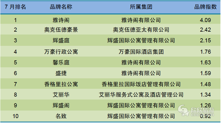 7月,服务式公寓品牌榜TOP10依次是雅诗阁、奥克伍德豪景、辉盛庭、万豪行政公寓、馨乐庭、盛捷、香格里拉公寓、艾丽华、辉盛阁、名致。