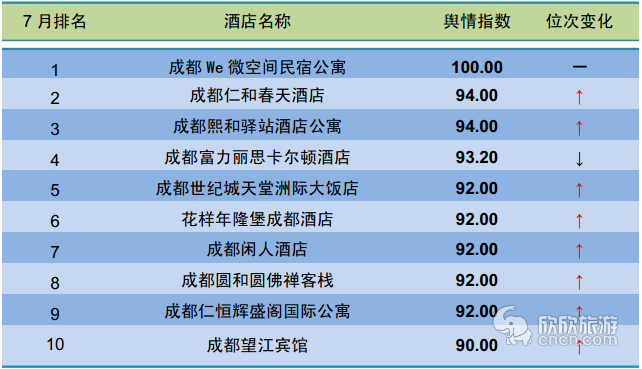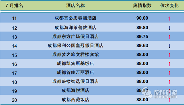 环比上升的酒店是成都东方广场假日酒店,指数较6月上升1.99%。环比降幅的酒店是成都保利公园皇冠假日酒店、成都富力丽思卡尔顿酒店,指数较6月下降4.65%、2.92%。
