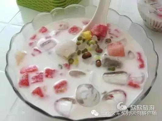 1.清补凉是风靡热带海南岛的特色冰爽甜品。主要是以红豆(绿豆)、薏米、花生、空心粉、椰肉、红枣、西瓜粒、菠萝粒、凉粉、椰奶等多种配料炮制而成的冰爽解渴饮品。吃起来香甜冰爽,而且薏米、红枣都是对女性很好的食材,女生们来到三亚一定要尝尝美味又健康的清补凉。火车头万人海鲜广场小食摊位都有,四季都有的卖。价格便宜,一般每碗8-10元,还可以根据个人喜好要求店家在配料上选多选少。