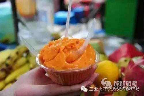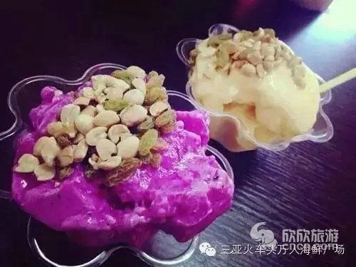 3.炒冰是夏夜消暑颇受欢迎的一种爽口甜品。用鲜果榨汁,混合炼乳,再冷凝盘上迅速翻炒,成冰,再加入各种当季水果制成各种风味的炒冰。炒冰的关键在于水果,清香甜润,皆为天成。炒出来的冰,质地细滑,入口即化,较之冷冻机制出的冷饮,另有一番美味。三亚火车头万人海鲜广场都有炒冰的摊位,去三亚火车头万人海鲜广场逛摊的同时别忘了来一碗水果炒冰,香浓的滋味一定让你回味无穷.
