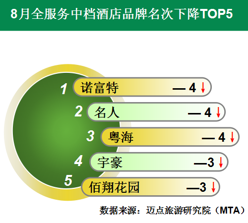 名次下降的品牌中,诺富特、名人和粤海均下降了4个位次,分别位列下降榜单第一至第三位。宇豪和佰翔花园均下降了3个位次,位列下降榜单的第四、第五名。