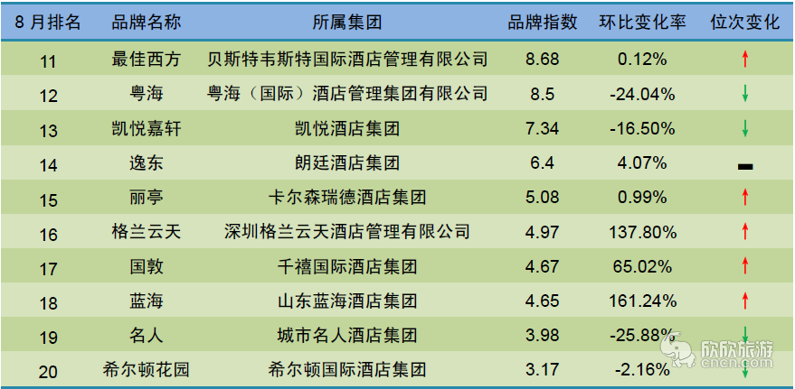 (1)8月,在受监测的30个全服务中档酒店品牌中,指数环比上升及下降的的品牌数量分别是20家和10家,上升数量占比为66.67%。