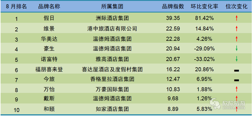 8月,全服务中档酒店品牌风云榜TOP10依次是假日、维景、华美达、豪生、诺富特、福朋喜来登、今旅、万怡、戴斯以及和颐。