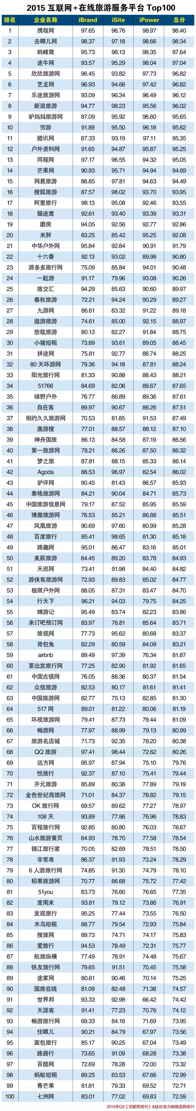 2015互联网+在线旅游服务平台Top100 欣欣入选前五