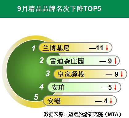 下降榜单中,兰博基尼品牌下降幅度最大,较上月下降11位。雷迪森庄园和皇家驿栈均下降了9位,分列位次下降榜单的第二和第三位。安珀和安缦分别较上月下降了5个和4个位次,位列下降榜单的第四和第五名。