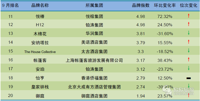 (1)9月,在纳入监测的38个精品酒店品牌中,指数环比上升以及下降的品牌数量分别为21个和17个。