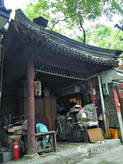 和假山、游廊相对的,是一座保存完好的四角方亭,亭柱表面的红漆已经斑驳、褪色。这座方亭正好夹在两座平房之间,亭子里堆放着自行车、塑料盆、鸟笼等物品,显然已被居民当成储物间使用。