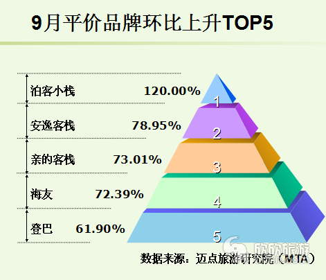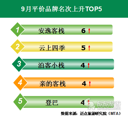 具体分析,从品牌指数环比增幅上来看,9月泊客小栈以167.88%的增幅排名第一。安逸客栈紧随其后,增幅为78.95%。增幅排名第三至第五位的是亲的客栈、海友和登巴,分别上升73.01%、72.39%和61.90%。