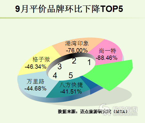 从品牌指数环比降幅上来看,9月尚一特的品牌指数环比下降最厉害,达到88.46%,港湾印象以76.00%的降幅位列第二,格子微、万里路和八方快捷的降幅分别为46.34%、44.68%和41.51%,位列降幅榜第三至第五位。