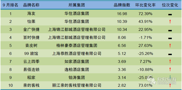 9月,平价酒店品牌风云榜TOP10依次是海友、怡莱、金广快捷、百时快捷、青皮树、99旅馆、云上四季、易佰连锁、稻家以及亲的客栈。