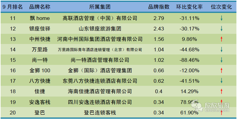 (1)9月,在纳入监测的27家平价酒店品牌中,共有13个品牌指数较上月实现了环比增长,占比为48.15%。环比下降的品牌数为14个。
