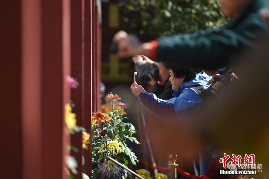 近日,北京市第三十六届菊花展在北海公园开幕,2000余盆名菊与市民游客见面,不少摄影爱好者驻足拍摄。据介绍,此次展览共有26家参展单位的2000余盆菊花汇聚一堂,其中包括独本菊、案头菊、小菊盆景、插花等,菊花品种达上百个,还有金背大红、盘龙春晓等十多个精品品种,特别是花瓣正面为暗红色,背面呈黑色的“墨萍”,在花中十分少见。
