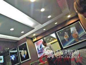 经过一番讲解之后,再进入手表店,房间门一打开,手表店内热闹非凡,销售人员的声音此起彼伏。整个免税店内被设置成曲线形单向路线,游客需要依次经过每一个手表柜台。
