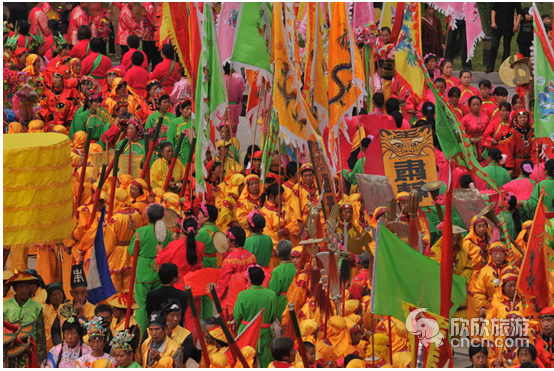 娲皇宫庙会另一特点就是“非遗”。女娲祭典是国家非物质文化遗产,其中最重要的活动是民间祭祀。祭祀以摆社为主要形式,祭典中,来自四村八乡的民间社团,自发组织队伍,全副古装穿戴,手举祭旗、长龙、雄狮、功德旗等各式祭器,浩浩荡荡地来到娲皇宫祭祀祈福,场面壮观,充满了浓浓的节日气氛。除了民间自发性的祭祀活动,涉县政府也大力筹办了精彩纷呈的文化活动,包括唱大戏、坐夜、打扇鼓、垒石子、结红布、绑娃娃、开锁等。这些富有传统特色的文化活动,不仅展示了涉县传统的民风民俗,同时也为娲皇宫庙会增添了浓重的文化色彩。
