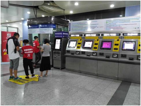 在动物园站进站口附近的网络取票机旁,立着三幅易通行易拉宝广告,介绍其功能,以及下载App的二维码,但站内人流量不大,到访时没有看到乘客在尝试使用。奥体中心地铁站的通道里也张贴着网络购票应用易通行的广告稿,这里客流密集,人口售票窗和自助购票机前排满了长队。网络取票机前也排着五六个人。