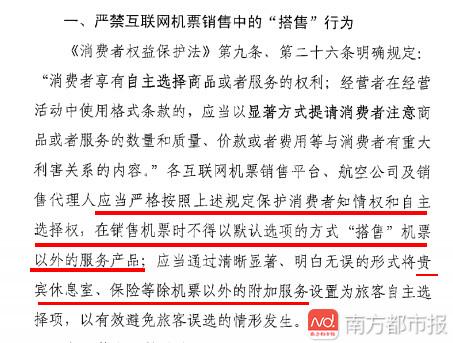 事实上,民航局运输司8月9日也发布了《关于规范互联网机票销售行为的通知》。通知中明文规定:“在销售机票时不得以默认选项的方式‘搭售’机票以外的服务产品;应当通过清晰显著、明白无误的形式将贵宾休息室、保险等除机票以外的附加服务设置为旅客自主选择项,以有效避免旅客误选的情形发生。”