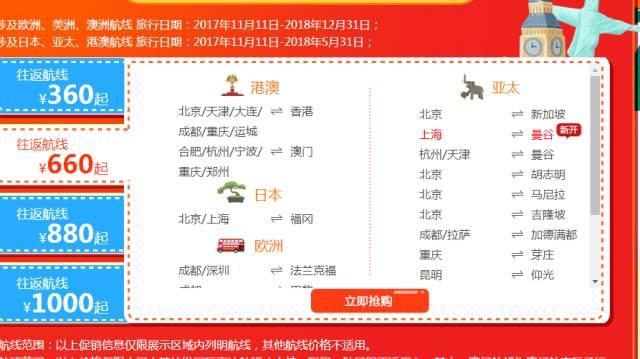 欧美航线促销使用日期只到年尾,所以这次比较推荐日本、亚太、港澳航线,旅行日期直到明年5月底,但大部分屏蔽春节,清明和劳动节。