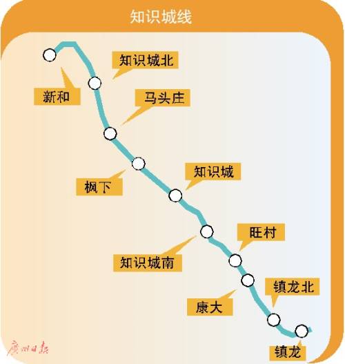 知识城线(新和-镇龙)线路总长21.9公里,地下线长19.9公里,地上线长2公里,主要沿九龙大道敷设,共设10座车站。分别为新和站、知识城北站、马头庄站、枫下站、知识城站、知识城南站、旺村站、康大站、镇龙北站、镇龙站(以上站名均为暂定名)。其中,新和站与14号线一期换乘、镇龙站与21号线换乘。
