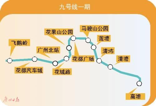 九号线全长20.1公里,均为地下线,设11座车站,设飞鹅岭、花都汽车城、广州北站、花城路、花果山公园、花都广场、马鞍山公园、莲塘村、清㘵、清塘、高增等11座车站,其中高增站与三号线换乘。