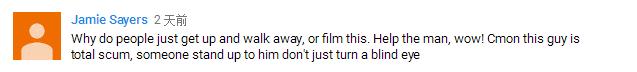 为什么人们只是站起来走开,或者拍着视频。应该站起来帮这个亚裔男子啊!拜托,这白人男子真是个彻头彻尾的人渣,应该有人站起来而不是装作没看见。