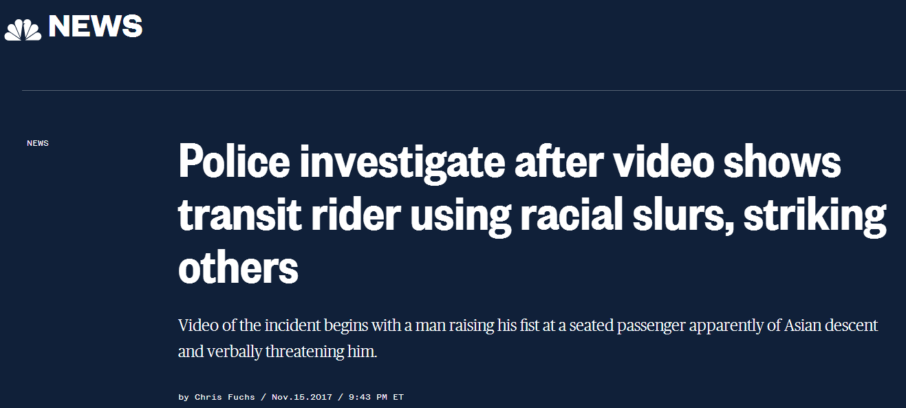 《美国全国广播公司》(NBC):地铁乘客大叫种族辱称震惊众人,警方介入调查。