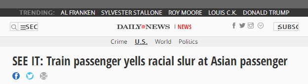 《纽约每日新闻》(NewYork Daily News):白人乘客向亚裔男子大喊种族歧视字眼