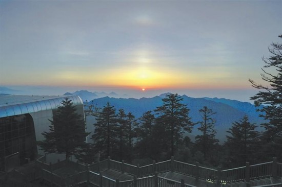 站到观景台上眺望,又是另一番景象。蓝天、彤云,还有披红挂彩的山脊和云海,绚烂的画面让人顿时有了身处蓬莱仙境的感觉。
