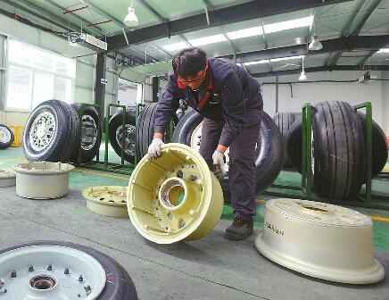 在翔宇航空,工作人员对飞机轮胎进行检修。