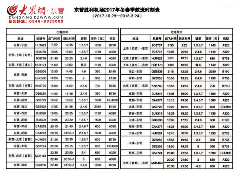 大众网东营12月7日讯(记者 李江峰 通讯员 刘垚)7日,记者从东营胜利机场获悉,12月7日至12月31日期间,由东海航空公司执飞的DZ6255次航班因航空公司航班计划调整原因,东营至天津段航班时刻略有调整。