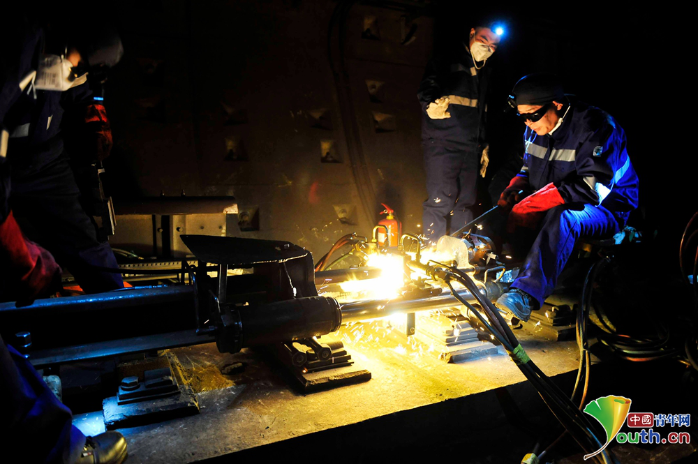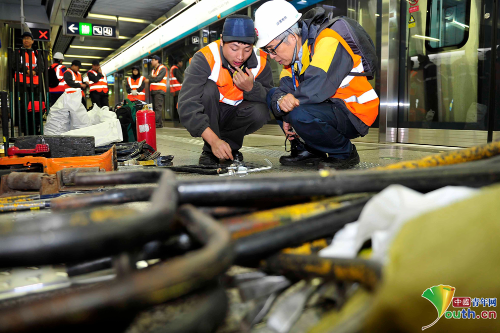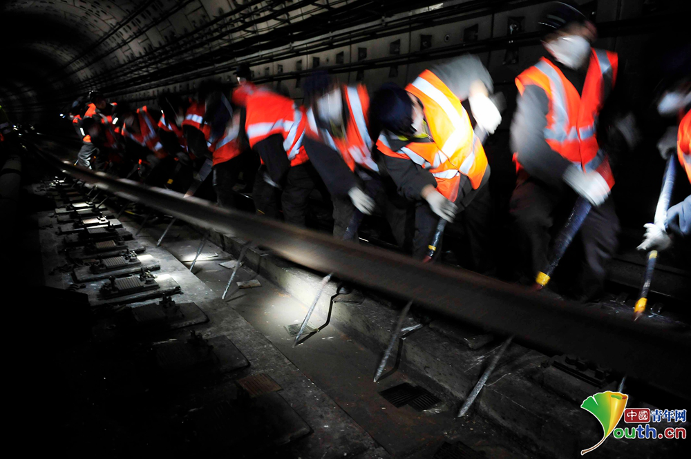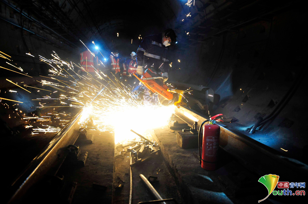 京港地铁工作人员正在更换钢轨。中国青年网记者 刘尚君摄