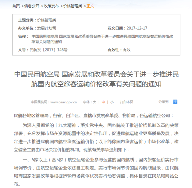 2017年12月底,《关于进一步推进民航国内航空旅客运输价格改革有关问题的通知》(下简称通知)再次发布。