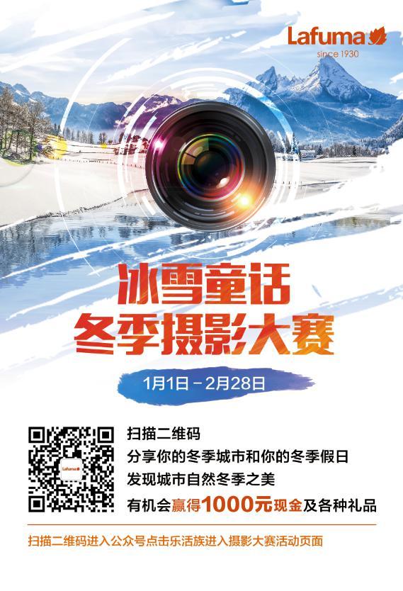 此次“乐活天下”系列活动之“冰雪童话”冬季摄影大赛,Lafuma乐飞叶致力于发现城市自然冬季之美,鼓励大家无论身处城市,还是在户外运动或度假旅行,都可以通过镜头记录下冬日的风光、人像或人文,一起分享生命中那些珍贵的瞬间与心情。