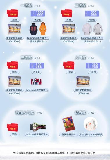 本次摄影大赛的一、二、三等奖及优秀奖作品,最终将由专家评审及大赛评审团,依据表现力、艺术性、主题性,以及互动性等标准,通过专业评选而诞生。优胜者们除了将获得现金、游侠客旅游代金券,作为特约冠名商的Lafuma乐飞叶,也带来了品牌冲锋衣、速干衣、野餐垫等众多有口皆碑的人气产品,助力冬日户外运动旅游。
