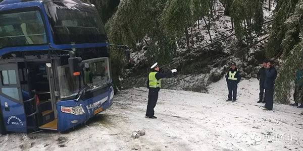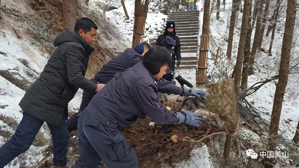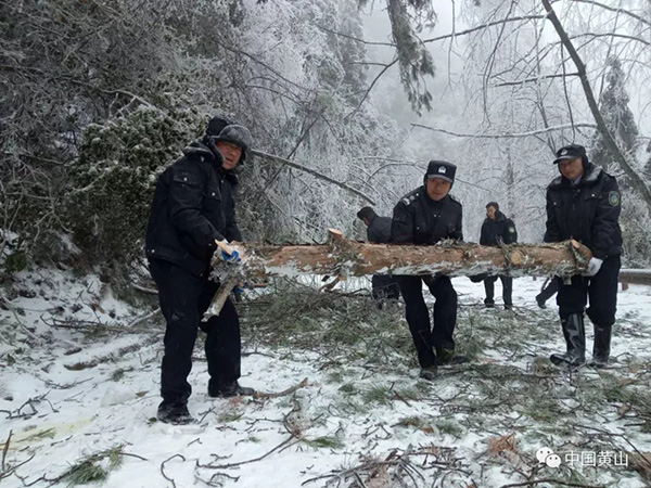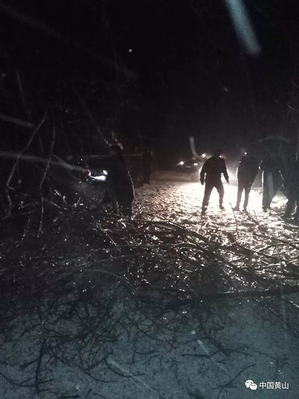 图五:27日晚10时左右,黄山风景区玉屏景区因树木倒伏造成断电,景区温泉片区综治、园林、公安会同电力等多部门近40人紧急联动,冒雪奋战,斩荆棘、爬冰柱,连夜抢修,于28日凌晨1点20分恢复通电,为来山游客和在山职工的用电提供了有力保障,为迎客松保护、索道运行的用电赢得了宝贵时间。