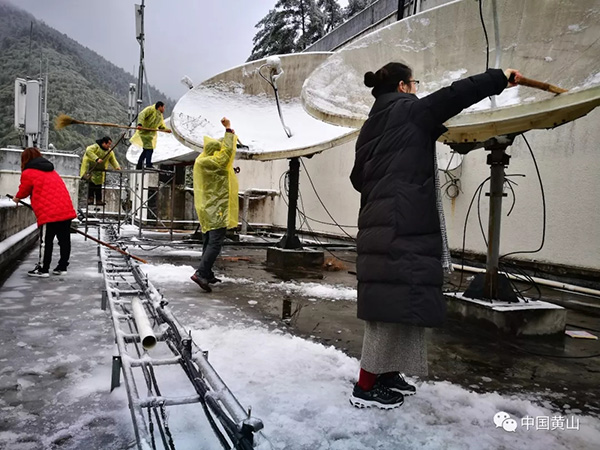 图七:为确保电视信号传输正常,景区电视部门工作人员爬上天台,对电视转播天线(锅)进行铲冰除雪。