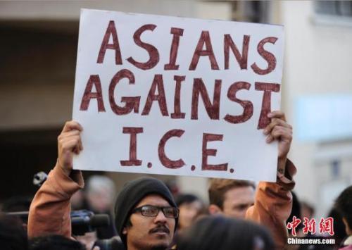 资料图为手举标语牌、针对美移民改革的抗议人士。中新社发 陈钢 摄