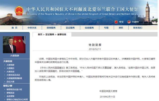 近日,中国驻英大使馆更新了一则消息,表示发现某些已经加入外籍并持有中国签证的申请人,涉嫌骗取中国护照,大使馆已依法处理。