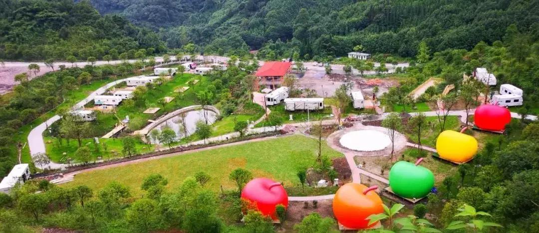 途悦·霞客行房车度假营地深居赵公山、临近紫坪铺,营地占地面积2万6千平方米,海拔高度约1300米,属全国首家山地房车露营营地。全新的旅游住宿新体验,山中5个大大的娇艳欲滴的苹果,竟是一间间萌萌可爱的小屋子。小屋外表由一种鲜艳的塑料张拉膜做成,里面摆有双人床、桌椅、电视和集成卫浴房等,俨然就是一个温馨浪漫的亲子小屋。