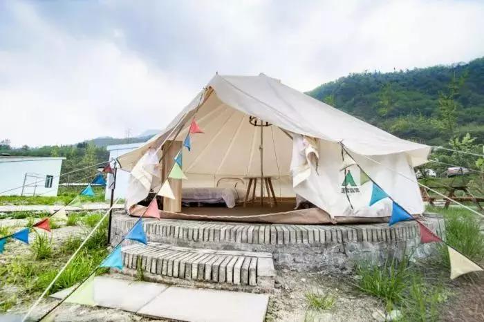 篷客露营高原河谷营地位于都江堰虹口景区,是一家Glamping野奢露营地,现共有30顶牧阁帐篷,内部通电,配置有高端床品、床垫,让你能够在享受酒店级露营之余,尽情融入周边自然环境。除了美丽的风景之外,舒适帐篷露营区外,营地还有CS丛林区、射箭场、山地自行车、沙滩运动区等户外活动项目,玩累了,还能在休闲小吃区架上烧烤架,美滋滋的吃一顿。