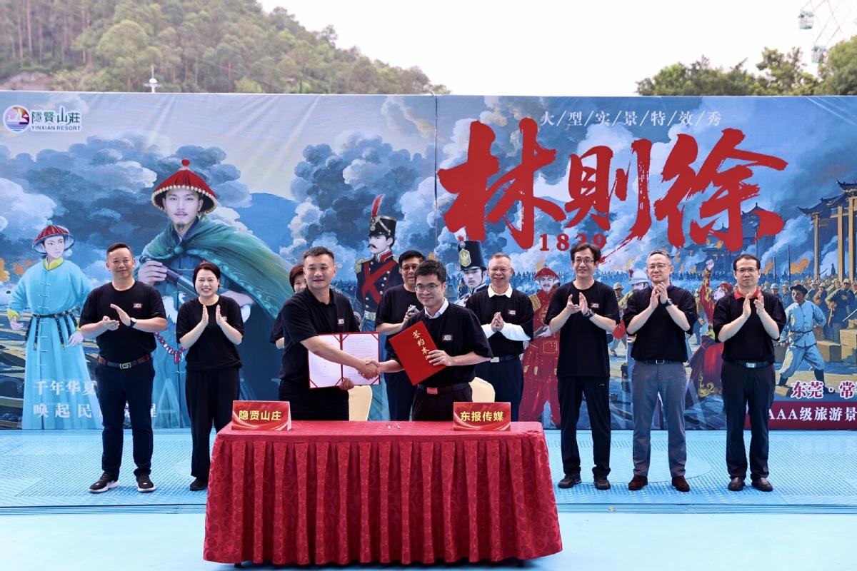 4月26日,一场震撼人心的实景演出——大型全景特效秀《林则徐1839》在隐贤山庄震撼试演。此次演出凭借其独特的艺术魅力与精彩的表现形式,为现场观众带来了一场跨越时空的沉浸式体验,将观众带到那段波澜壮阔的历史岁月。活动现场同时举行隐贤山庄与东莞日报社战略合作签约仪式,并同步启动“万元全网征集推广口号”的活动。现场特邀东莞文旅领域专家学者、媒体代表及公开招募的市民、当天游客共3000人共同见证这一文旅融合盛事。