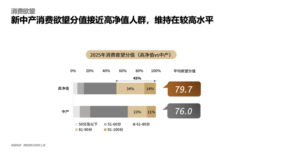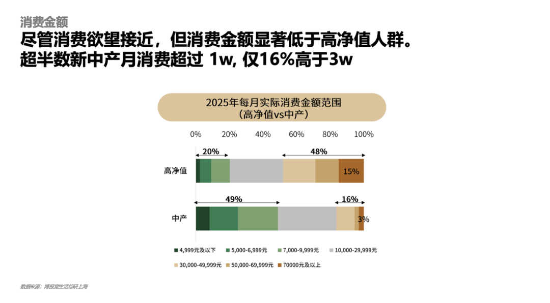 在这次沙龙上,Vogue Business 分享了几组数据。在传统的人群之外,正在崛起的新中产成为一个关键的人群增量。他们的消费欲望接近于高净值人群,但消费金额显著低于高净值人群。