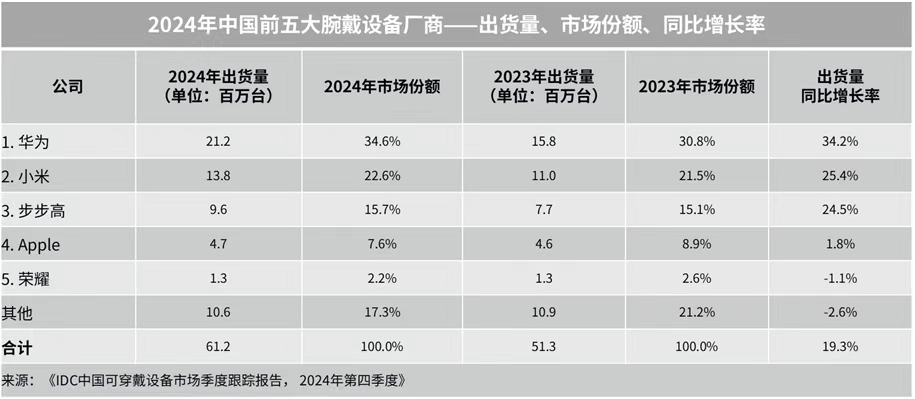 我专门去查了数据来验证这个观察。去年占据中国腕戴设备市场份额榜首的是华为,它的出货量同比增长甚至超过了 34%。