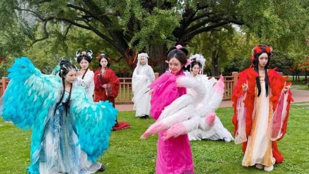 此外,《凤鸣朝阳》《山海灵韵》《哪吒闹海》等神话主题舞蹈轮番上演,舞者身着华服,在秋日晴空下演绎上古传说,引得游客纷纷举起手机记录精彩瞬间。